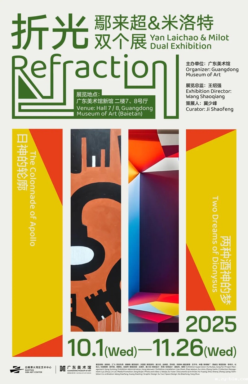 Guangdong Museum of Art presents "Refraction—Yan Laichao & Milot Dual Exhibition," exploring the dialectic between rational order and sensual impulse through the metaphor of optical refraction.