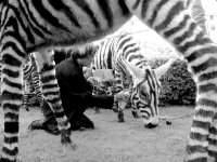 在海外华人艺术家中,徐冰是和黄永平、蔡国强和谷文达齐名的天王级人物。他的《天书》、《文化动物》、《鬼打墙》等作品曾经强烈地挑战了中国人和外国人的视觉神经、文化意识和羞耻心。他那禅宗大师般的矛盾意味曾经吸引了包括德里达在内的大哲学家。这次三年展中,他的《鬼打墙》被放置在展厅最醒目的美术馆入口处的大厅,占去整整一面大墙。似乎没有在美国的那次展出那么惊心动魄。他最新做的《野生斑马》同样具有强烈的悖论意味———看上去完全是斑马,结果却是四头白毛驴。这种轻度的虐待不会受到指责。四头白色的斑马-毛驴在美术馆后院的草地上吃草,发呆,不知道它们的明星照已经刊登在报纸和杂志上。记者在三年展筹备期间采访了徐冰。