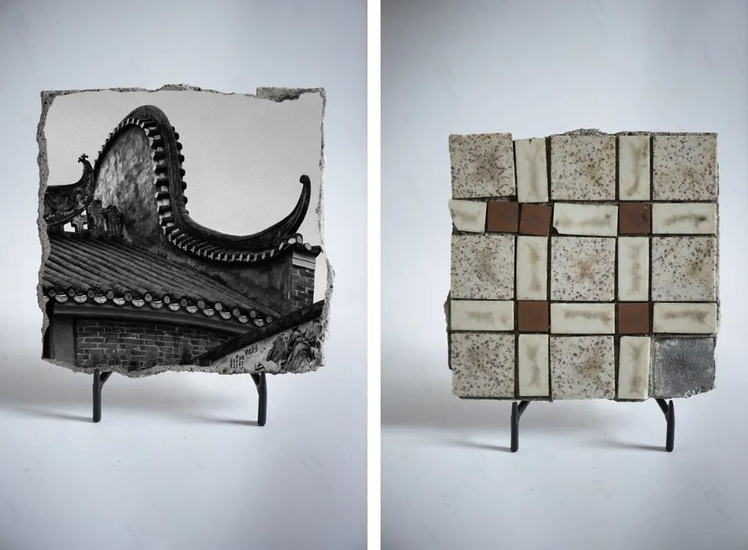 《洲表村》系列取材自佛山洲表村现场收集的木雕残件、石米墙与砖块,构建出“物-影像”的双重档案。正面影像呈现传统建筑的精致细节——木雕门楣、灰塑装饰、青砖黛瓦;背面的瓷砖拼贴则是20世纪中后期现代化改造的物质遗留。这种正反面的并置构成了压缩的“时间地层”:传统工艺与工业化材料、手工痕迹与批量生产、文化记忆与现代化扁平——在同一块混凝土碎片上叠压共存。物质不再是被动的承载物, 而是主动的历史书写者,以自身的磨损、断裂、叠加记录着被官方历史忽略的微观叙事。