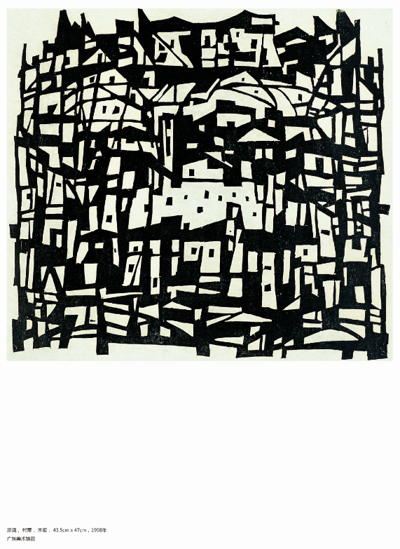 馆藏的这幅《村屋》巧妙地运用了木刻版画中的强硬的线条和色块组合,创造出有趣的画面。无论用平刀在椴木板面刮划戗凿的印痕,还是在宣纸上纵横组合的淋漓水色点线墨块,抑或笔点刀刮推敲而就于油画布的朦胧明丽的色调造型,彦涵的作品处处体现着他对生活的理解。