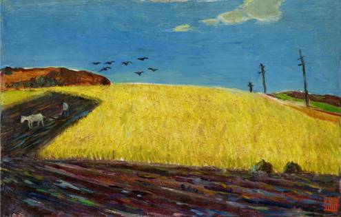 在余本的写生作品中有很多都是从火车上所看到的景物,但当时不可能对景写生,连抅图完整的铅笔稿都来不及,而余本却从车窗外,变幻万千的构图中选取了画材。这些画稿不像一般构图的取景,没有所谓近景中景远景的错落层次,其中如《金色的农田》这种整整一大片金黄,一大片黑紫的颜色的并列,在许多人的创作中是常避忌的,但余本正好运用它表现了无边麦地的丰熟,和机耕畜耕的结合的,大规模生产的新垦农场自然风貌的特征。景物是那样的单纯——只有土地、熟麦、蓝天和飞鸟;色彩也是那样的单纯,然而给人的印象却是麦海滔天,一片丰收的气象,黑中泛紫的土地,像闪着油光,更给人以得天独厚的感觉。这种构图主要是利用平地上的田畦横直斜线组成,给人舒展开阔的感觉,恰恰符合这一题材的特点。而这种新鲜的构图正是从火车运动的变化中得到的,并非按照具体对象如实写生,但是它所表现的景物的特点和感觉,却是非常真实的。
