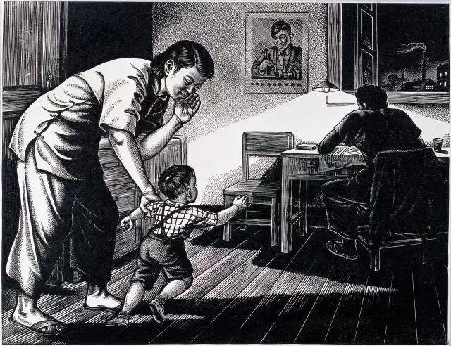 微信菌找到的第二张作品,是林仰峥的黑白木刻《爸爸在工作》。新中国建立后,人民群众对于国家的发展怀有空前的热情,尤其是工业方面的建设。林仰峥的木刻作品《爸爸在工作》正展现了这一时期的家庭生活一隅:画中的父亲正在灯下努力工作,书桌上放着一张图纸,似乎说明父亲的身份是一名工程师或是工人。窗外远处的工厂烟囱正在排气,显示工厂一直运作到深夜。窗户的旁边是一枚用图钉固定在墙上的海报,海报上画着一个正在调零件的工人。房门处,他的妻子拉住了想要找父亲玩耍的孩子,用手掩着嘴,小声地劝阻孩子“不要打扰爸爸工作。”微信菌小时候也曾经历过这样的场景,你呢?