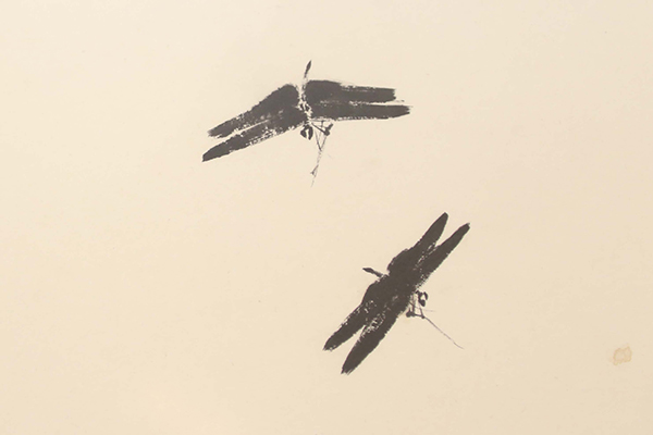 可以单独用墨色来画,也可用多种颜色来画。毛笔先沾调好的淡色,再礁深色在笔尖上;也可以先礁深色,再蘸清水来画。每一笔都要有深浅的变化,产生乾、湿、 浓、淡的不同效果。点捺之间,蜻蜓就活过来了。