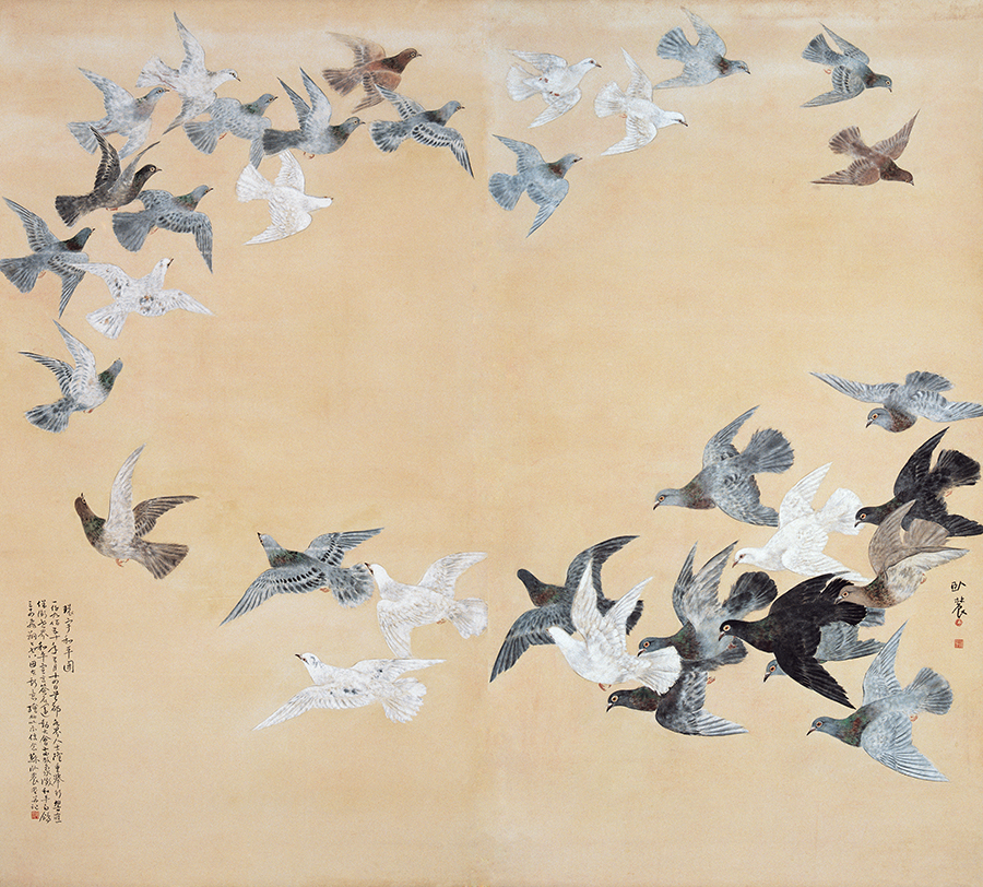 苏卧农师从高剑父。他曾在日本留学,归国后从事艺术教育工作。新中国成立之后,艺术家们顺应时代要求进行主题创作,对中国画进行了革新。苏卧农在1950年创作的《环宇和平图》体现了艺术家对中国花鸟画传统构图模式的创新。艺术家在画中精心描绘了34只鸽子,用笔精细,色调平和,整体工整而灵动。这些鸽子围绕成一个圆环形状,向上飞翔,呈现出蓬勃向上的气势。艺术家这种别出心裁地的圆状回旋构图方式,与传统花鸟画的左右、上下构图形式截然不同。在当时,这是一种新颖的中国画构图方式。画上题款说明了他创作此画的意图:“一千九百五十年五月十四日,首都各界人士隆重举行响应保卫世界和平宣言签名运动大会前,放象征和平白鸽三十四,飞翔上空。因本斯意绘此以示信念。苏卧农画并记”。此画入选了第一届全国美展。