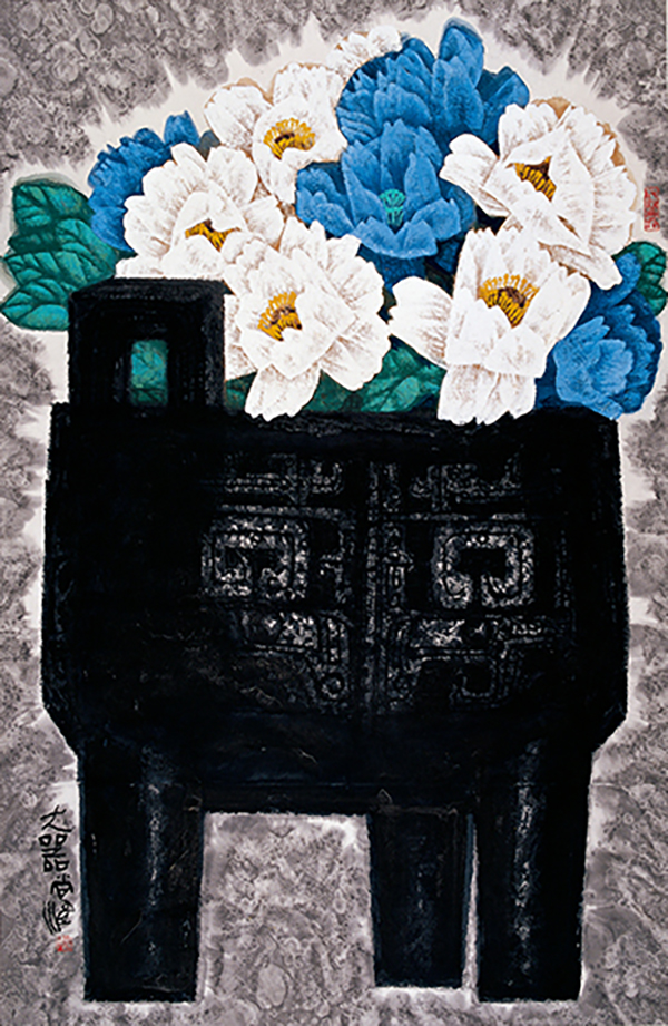 尚涛的作品画面多以墨色为主,构图饱满,内敛素朴中现外张之气势,造型极具个人特点,带有憨朴文雅的“凝重”“拙厚”。这种风格在很大程度上改变了传统写意花鸟的书写性和抒情性,赋予了花鸟、静物近乎建筑与雕塑的体量感和力度。作品《大器》描绘了象征中华文化深厚凝重、灿烂雍容的大鼎和牡丹。造型奇倔古拙,设色端庄浓烈。这份儒者的气度体现了他对国家、对生活和艺术始终有着一种美好和善良的信念。