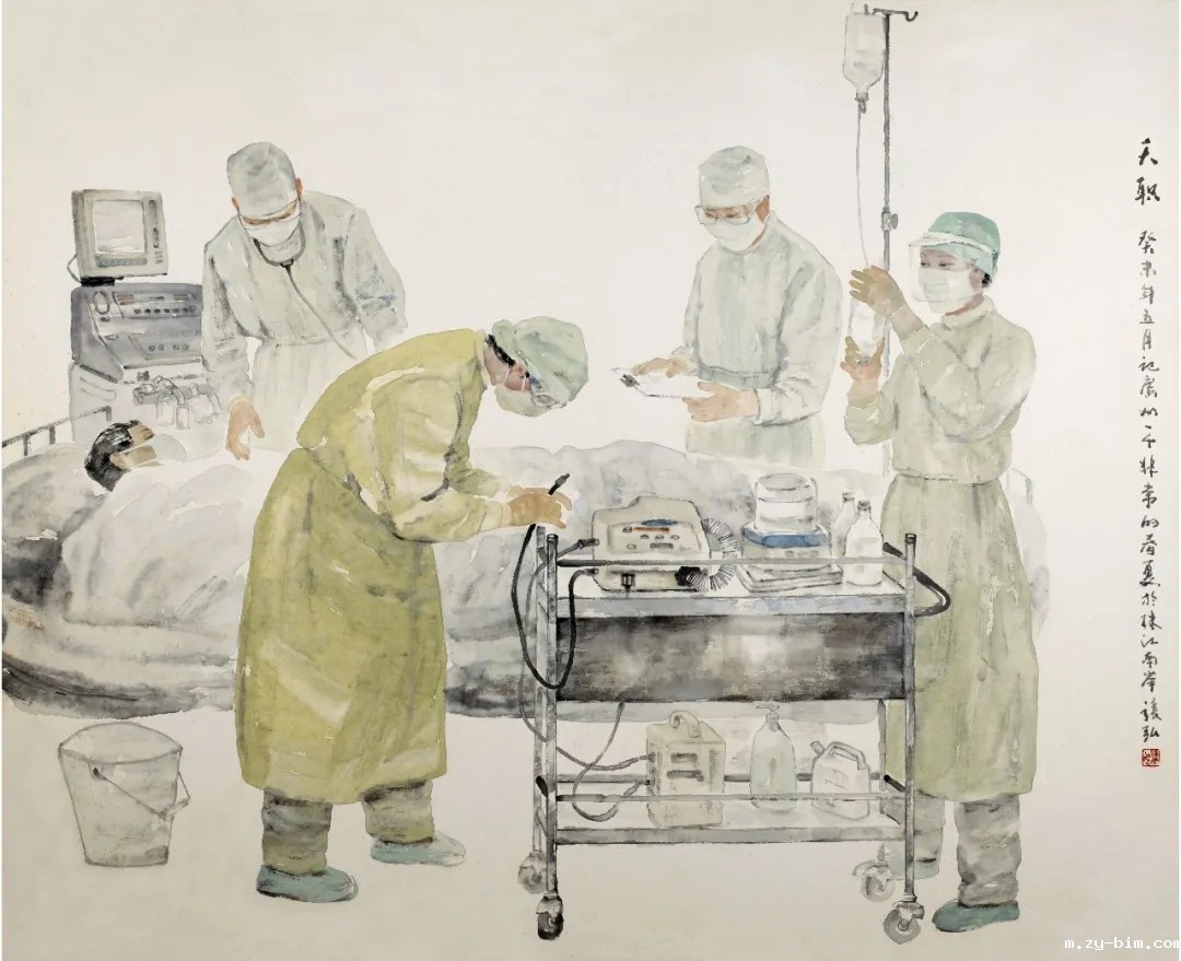 《天职》是广州美术学院张弘教授在2003年非典疫情期间,创作的一幅表现医护人员临床救治病人场景的作品。他在创作过程中,为了深入了解情况,更好地收集创作素材,与电视台记者进入广州第一人民医院隔离病房采访,亲身目击了医护人员在病房中忘我抗击疫情的瞬间。