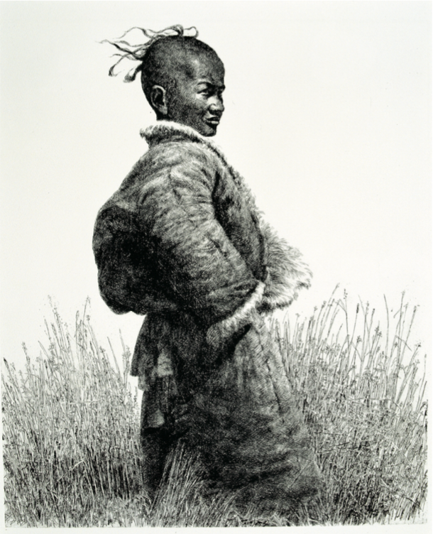 吴长江的作品多表现藏族牧民生活以及青藏高原的悠远。此幅作品黑白色调丰富细腻,人物的神态活泼生动。他通过描绘对象的外部特征,挖掘出人物的性格美:坚韧、淳朴、憨厚;同时也展现了青藏高原的地域美:宁静、高远、博大。