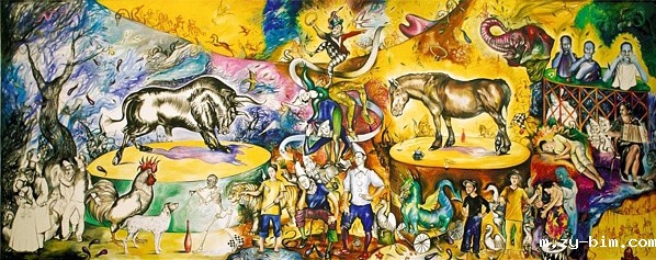 最后,作为艺术品,它自身独特的审美价值、历史价值使它将永远熠熠生辉——这是一件典型的后现代主义文化背景下的杰作,与“新表现主义”绘画渊源密切,能够看到约尔克•伊门道夫的技法影响和精神影响,但卡默罗却有自己鲜明而独特的语言结构以及价值取向。卡默罗的画面气氛并不象题目所提示的那样具有梦境的特征,而是洋溢着节日般的欢快感,这种欢快感并不喧嚣、热烈,克制的宁静使节日般的欢快感有了类似宗教的神圣性,这种神圣性有效地抵制着现实给人的压迫感、焦虑感。画面主题由人和动物组成,这些形象的意义在于象征性——卡默罗即刻画了古代的人,又描绘了现代的人,以及世界各地的人种,尽管人物众多、活动多样,这些人一律都被刻画为生气勃勃的年轻人——艺术家本人也在其中。 画面的另一主题是动物——由神兽、野兽 、家畜组成。画面被一组小丑表演的人梯从中间一分为二,左半边描绘一头野性十足的大公牛作抵角状,右半边刻画一匹非驴非马的骡子,温顺乖巧。人和动物铺天盖地,充满在整幅作品营造的非物质空间中。画面中没有刻画大自然,也没有刻画人为自然——建筑物以及建筑空间内部,而只草草描绘了一颗很大的树,可是它看上去像是要死了,又像是要活过来一样。可以从以下角度解读这件作品:原始的野蛮冲动充满挑战性、令人深深敬畏却兽性十足,驯化后的文明温文尔雅、温顺乖巧却没有爆发力;人类的自私自利象各种兽类,傲慢到不需要大自然陪伴而任意摧残它或抛弃它,也难说他不被大自然所抛弃;人类的所有行为一本正经,但小丑们表演时不也一本正经吗?……所谓的人类“文明进化”的历史,可以这样饶有趣味的以后现代主义的视角阅读、理解下去。