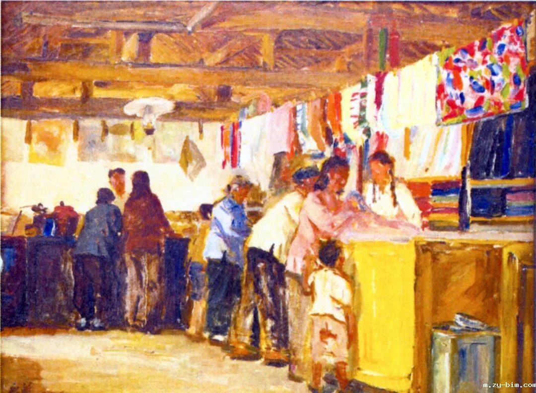 作品以暖黄色为主色调,描绘农村供销合作社中的场景。艺术家用丰富的色彩表现合作社中琳琅满目的作品。画面内男女老少动态各异。左侧通过阴影与冷色的运用,一方面加强画面的纵深感,另一方面与右侧前端的销售台形成呼应,足见艺术家构思之妙。
