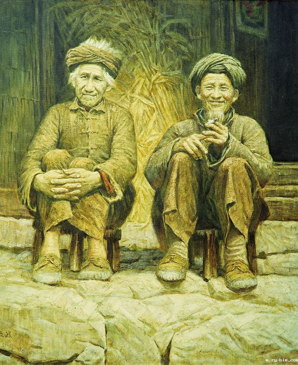 黄文波曾六次到达桂西隆林各族自治县,深入体察偏远山区尚未受到污染的大自然的奇特美景,熟悉少数民族传统的风俗与纯朴的性格。《山里的阳光》描绘了一男一女两位苗寨老人闲坐歇息的场景。两位老人的帽式呈现出不同的风格,脸上同样露出笑容,老奶奶的笑容略显腼腆。阳光照在他们脸上,他们的土地上,以及他们背后的作物上。背景左右两侧的暗部衬托出阳光的温暖质感,与老人温暖的微笑形成呼应。