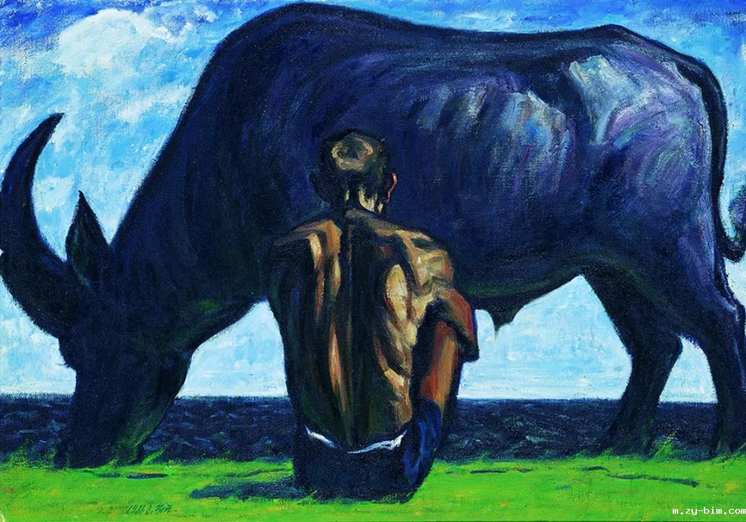 上世纪80年代初,杨尧创作了一批油画,后来被称为“土地”系列。作品描绘了一个黝黑结实的农民背影,一头雄壮的牛正在农民跟前吃草,牛的身姿几乎占满整个画面,给人以一种崇高感。艺术家在草地与蓝天间涂绘一片暗蓝色,与牛的身体、农民的下肢的用色相呼应,像是大海又像是黑土地。该作品风格并不如同时期四川的乡土现实主义般写实,农民与牛身上的肌肉在光影衬托下呈现出强烈的块面感,让人想起塞尚的画风。画面中坚实的牛,端坐的人与灵动的云,飘动的野草形成一种视觉张力。