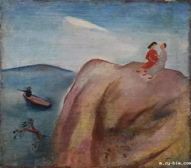 亲切的弧线,温暖的色彩,天空的青蓝融入大海,天上的云也是散散地飘着,海天相接的地方不是一条直线,而是像心潮一样起伏。画面的左侧是蔚蓝的大海,海面上漂浮着一叶孤舟,一位渔翁正在垂钓。在画面的右侧,一对衣装入时的青年男女休闲地坐在礁石上,山顶谈心。天空、大海的颜色浑然一体,相互辉映,而山坡则采用了暖色,给人以宁静致远、轻松明快的观感。这一片喜悦、温馨的情景,正是谭华牧笔下的《风景》。画家用画笔过滤了尘世的烦嚣,带给我们宁静致远、轻松明快的画面,带来喜悦与欢欣的生活写生。