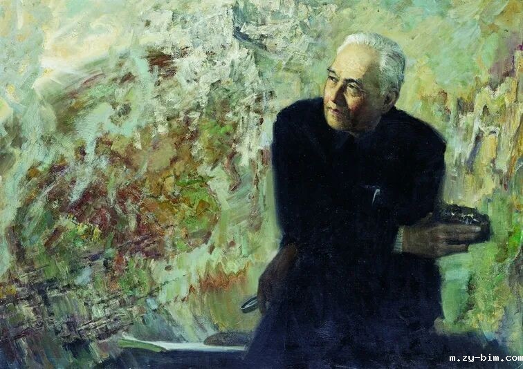 画面以一幅巨大的中国地质图为背景,刻画了李四光在工作室里手握矿石,思考的瞬间。通过这一块石头,李四光发现了大庆等油田,摘掉了“贫油国”的帽子。汤小铭巧妙地运用色彩与笔触,勾勒出地貌的瑰丽多姿。这不仅是对地质学家工作环境的真实再现,也寓意李四光所从事的地质事业如同这大地一般,既复杂多变又充满挑战。李四光正在思索,他睿智的目光射向远方,似乎在展望着祖国地质学的美好明天,也预示着科学发展春天的到来。