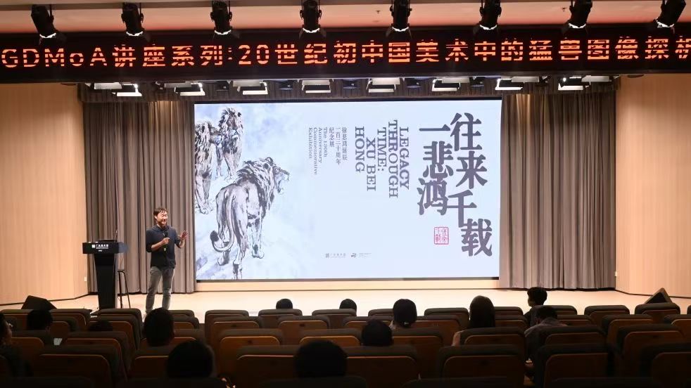 5月17日,广州美术学院郭伟其教授从20世纪初中国美术中的猛兽图像探析角度入手,以《从博物到机械:穿越时空隧道的猛兽》为题,带领观众从“观展”起步,进入美术名作背后的人文历史维度。郭伟其教授以徐悲鸿的动物画、狮子画等题材为起点,以倒叙的方式带领观众追溯中国近现代文化史中“醒狮”概念和图像的生成过程,完成了一次“穿越时空的解谜游戏”。