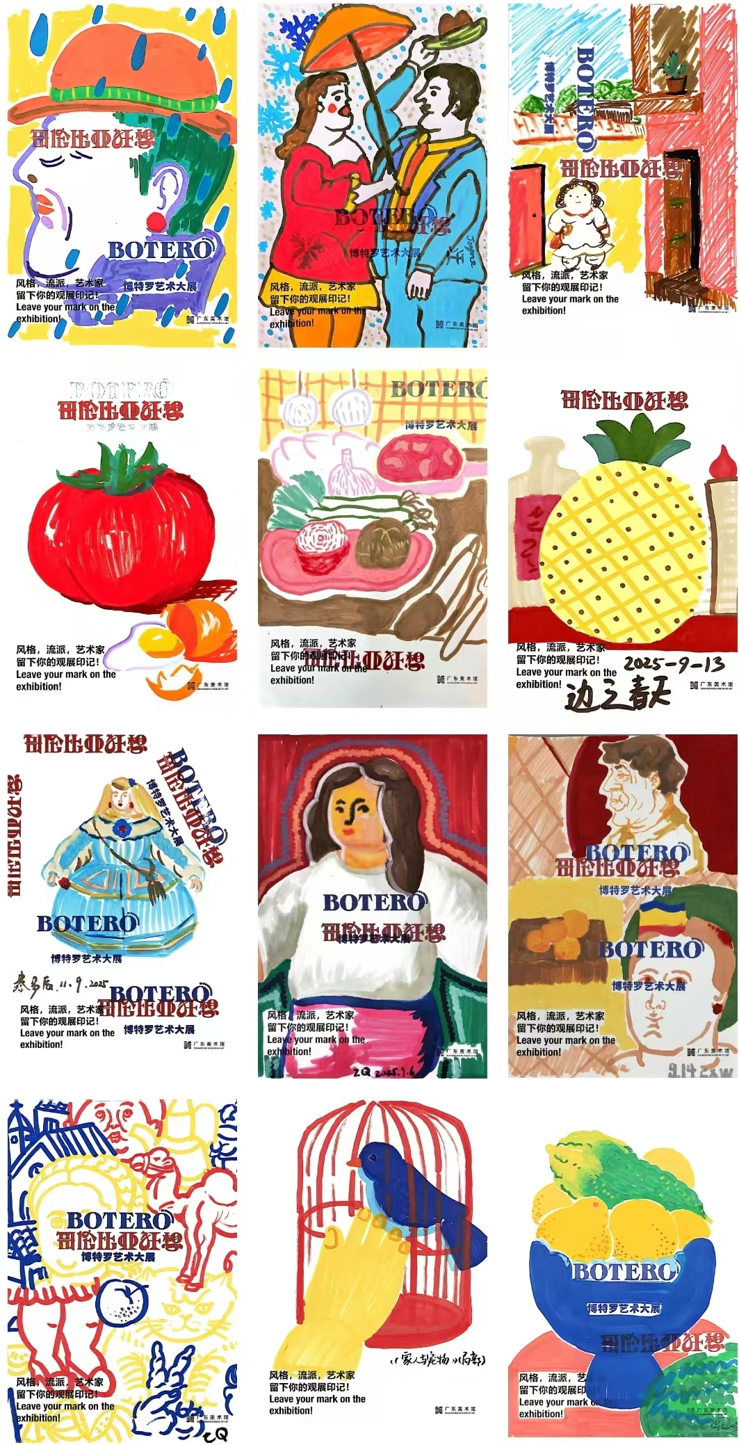 互动投稿是深受观众喜爱的活动之一。大家用画笔和限定印章,在互动纸上留下各种各样的画面:有模仿“博特罗风格”的创作,有临摹自己印象深刻作品的绘画;有的关注静物创作,有的关注人物题材;有的以色彩表达,有的用线条概括。观众与原作的现场相遇,与艺术家的精神交流,在这些投稿中留下了珍贵的印记。在展览期间,约200位观众将观展后的创作放入投稿箱,更多观众将画作带了回家。观众投稿在公共教育盒子的呈现,也为更多观众带来了新的视角和灵感,激发了大家对博特罗风格的好奇与兴趣。