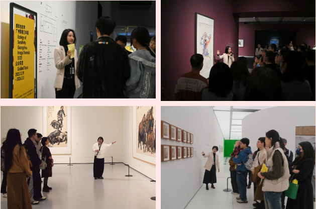 在白鹅潭新馆,观众跟随公共教育员郑晓萱赏读“如此漫长·如此浓郁——黄永玉新作展”,在阅读作品的精彩题跋的同时品味画作的趣味,体会黄永玉“文、书、画”合一的艺术风格与生活智慧;在“感知生态学——广州影像三年展2025”,公共教育专员齐健、徐云熵围绕“影像为什么触动你?”话题展开导览,结合互动纸和投稿活动,帮助观众建立丰富立体的感知体验;在“执古御今·2025范扬作品展”,公共教育专员陈冲向大家介绍了艺术家用生动笔墨描绘生活瞬间的意趣,解析何为“写生”。