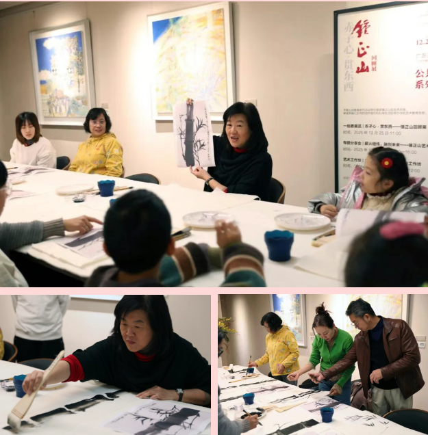 邀请艺术家亲属锺琳带领观众透过展览深入了解锺正山的艺术与教育理念。锺正山描绘的龙竹是竹子里的“大巨人”,和日常中庭院里的毛竹、盆栽里的文竹不一样,它植株高大却不易折,竹节一节一节向上攒劲,既有着刚正不阿的正直底气,也带着柔中带刚的坚韧韧性,中空的竹腔更藏着虚怀若谷的谦逊。在导览之后,主讲人将带领观众体验锺正山独创的写意龙竹绘画技法:用排刷画竹的枝干,再加寥寥数笔便能绘出竹子的苍劲枝节。