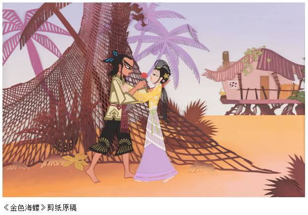 在正在展出的“ 世界动漫的中国学派——中外动漫艺术大展”中,有一批剪纸定格动画原稿,《金色海螺》《渔童》《抬驴》,每一件都做得非常精美。《金色海螺》以中国民间故事为主题,画面全部以中国剪纸形式制作,人物动作参考了皮影戏的模式,可谓是中国剪纸动画片的经典之作。