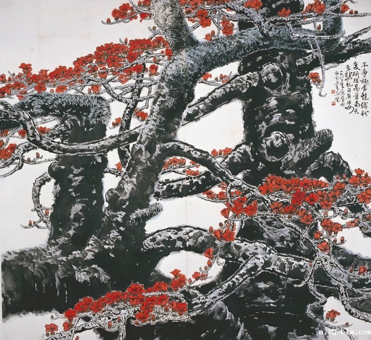 毫无疑问,正是源自寻求“个性”而不是皈依“派性”的动力,使黄志坚在笼罩着岭南花鸟画坛的甜熟而又矫揉造作的脂粉气中,找到了属于自己的壮阔雄伟的阳刚之气。黄志坚并不讳言,“柔靡的、堆砌的、纤巧的花鸟画”引不起他的兴趣,他追求的是“岭南春色郁郁葱葱秾丽而雄伟的意境”。翻开当代岭南绘画史,我们总不会漠视如钢浇铁铸的《龙虬》《双松》和如霞如火的《红霞》。在这些具有经典意义的作品中,我们可以看到,黄志坚虽然没有放弃传统的书法性线条意味,但他并不斤斤于笔触线条和墨彩的变化,强调图像的单纯性和视觉冲击力,在技巧上被简约为体积结构的雕塑感。于是,精确的写实主义语汇在这里被注入了诗化的理念。从 《龙虬》到《红霞》再到《长松颂》,在短短不到十年的时间内,他通过自己的努力,极大地转变了人们对岭南当代花鸟画的印象。特别有意思的是,如果我们将这些作品的造型结构抽绎为单纯的形式语言的话,不难发现,支撑着顶天立地的构图格局的是一个空间开阔而又用力均衡紧凑的“井”字。黄志坚的老师黄少强在谈到自己的作品的时候曾指出:“我的作品题材和构图‚向不喜因袭临摹,……虽然气韵生动有时非学能致, 但于骨法用笔以下四法能加以用功,神而明之,自可以如武穆谈兵:‘运用之妙,在乎一心’的了。”远拒甜熟俗艳之习用句式,融“秾丽” 于“雄伟” 不正是黄志坚以“心”体物、以“心”状物的收获吗!