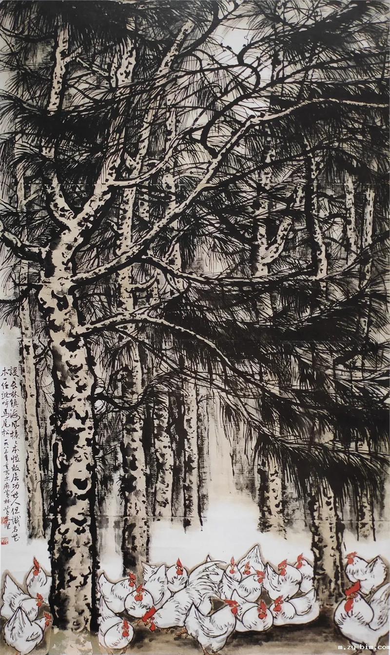 1983年作品《木麻黄》(图四),画面上部十分之八空间画木麻黄树林,用参差错落的墨线画前面两棵布满针叶的树枝、下部画了一组鸡群,中部留空透气,真可谓处理得“密不透风,疏可走马”。黄老先生题诗曰:“谡谡长林镇海风,榛榛本性敢居功?世人但识名花木,一任讹呼马尾松。”是呵,分布在中国南部沿海地区的木麻黄树林,虽榛榛草木丛生,却挺拔有力抵抗着呼啸的台风是镇海的防风林,但世人又有多少能真正认识它的价值?