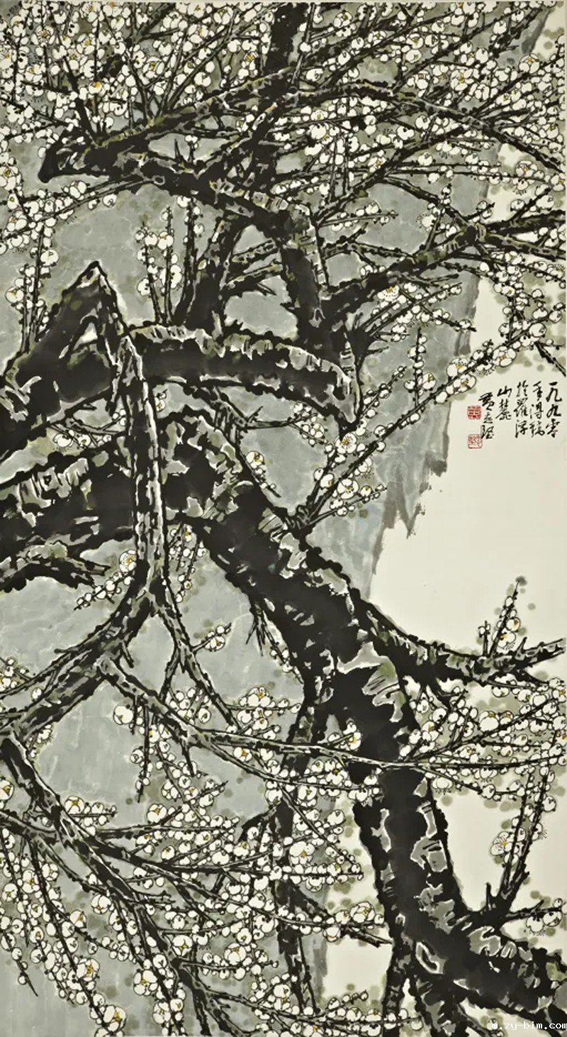 △图十一:黄志坚《悬崖白梅》 中国画 151x83cm 1990年 点点网登录藏