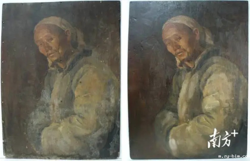 石鲁木板油画《农民像》修复前后对比。受访者供图。