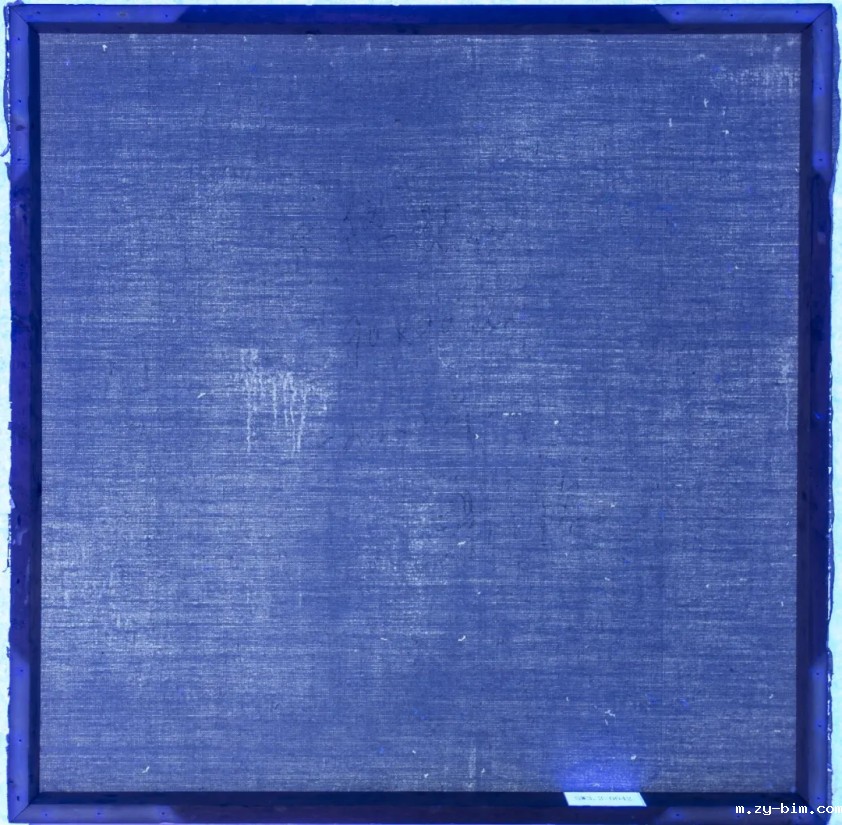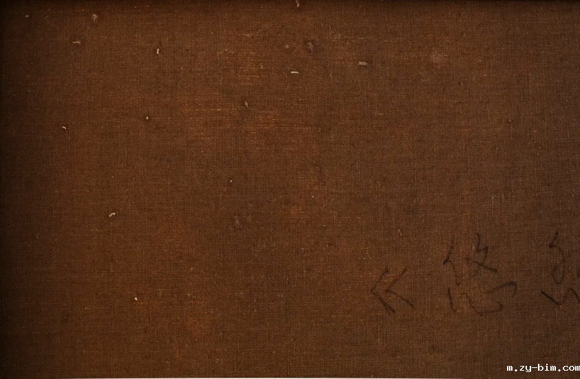 作品背面经检查后发现背面布面有积尘情况,画布绷在内框上的左右边缘部分有明显多处被白蚁蛀蚀的痕迹,导致这部分的画布纤维有多处缺失。画面背后的画布纤维也有多处被明显蛀蚀的痕迹,纤维缺失严重的部位甚于能够看见暴露出来的底子层和颜料层。
