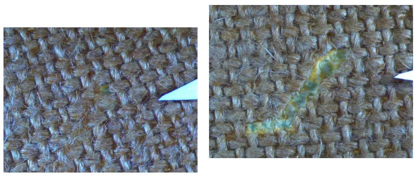 2.修补被白蚁蛀蚀而缺失的画布纤维破损,巩固纤维缺失部位强度,避免破损部位扩大。